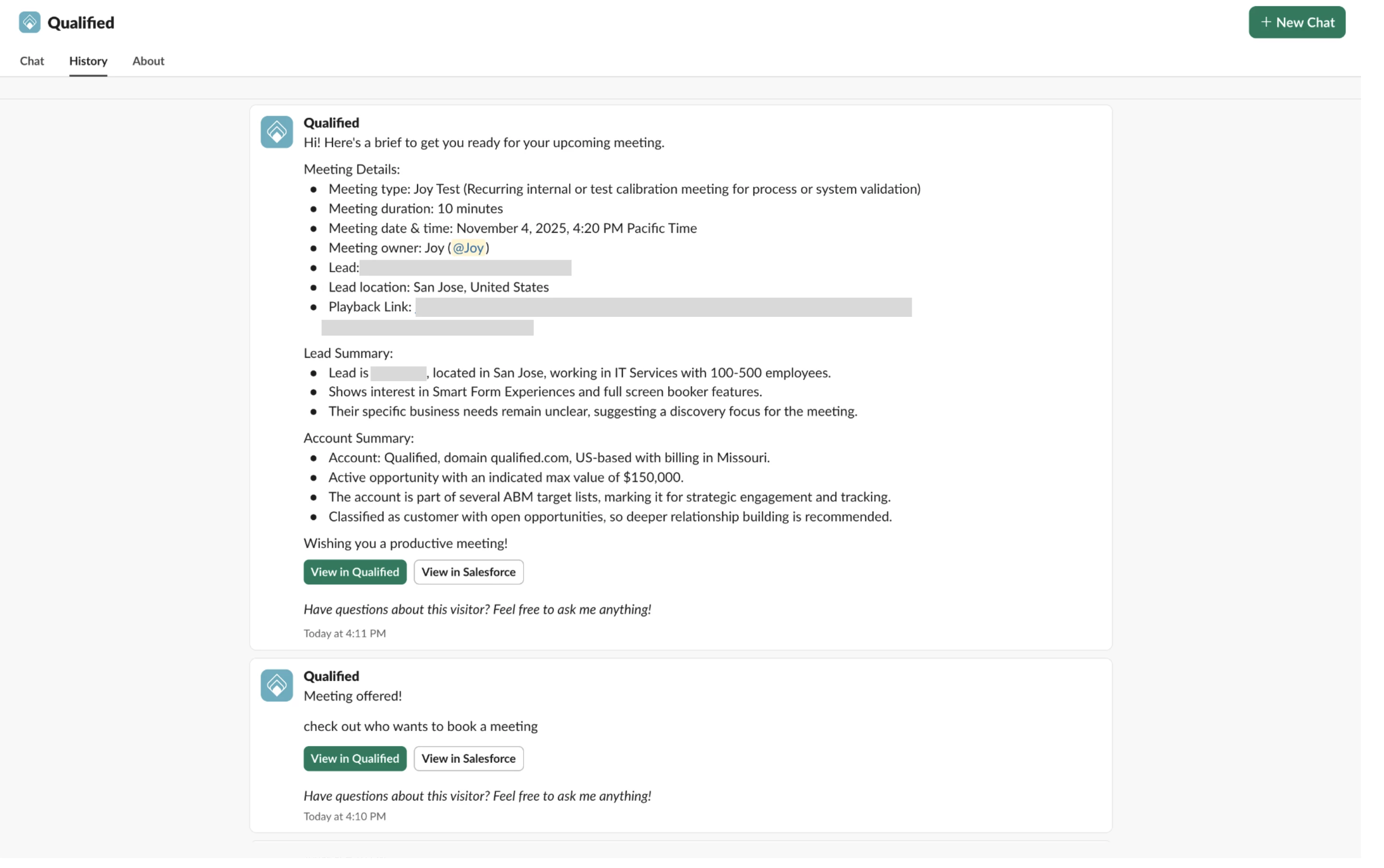 The Chat tab in the Qualified Slack app will always display the most recent meeting booked.