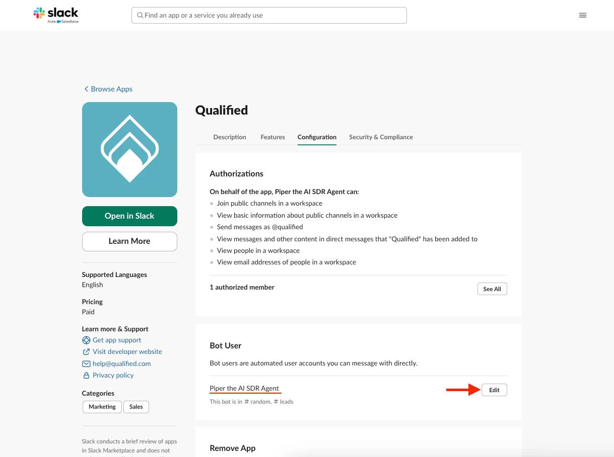 Once you’ve set up the Qualified app in your Slack environment, you can customize the appearance of the bot user that will send your reps messages. In the app’s configuration, click the Edit button next to “Bot User” to customize the name that appears in your Qualified messages.