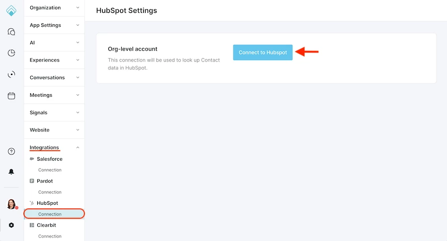 In Qualified, navigate to Settings → Integrations → HubSpot → Connection, and click the Connect to HubSpot button.
