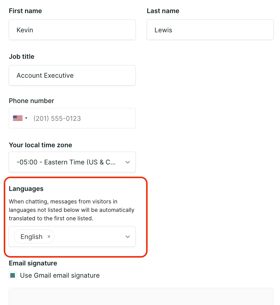 When this feature is enabled, English will be selected by default for all reps. If you speak more languages than English, use the drop down to select any additional languages that you speak.