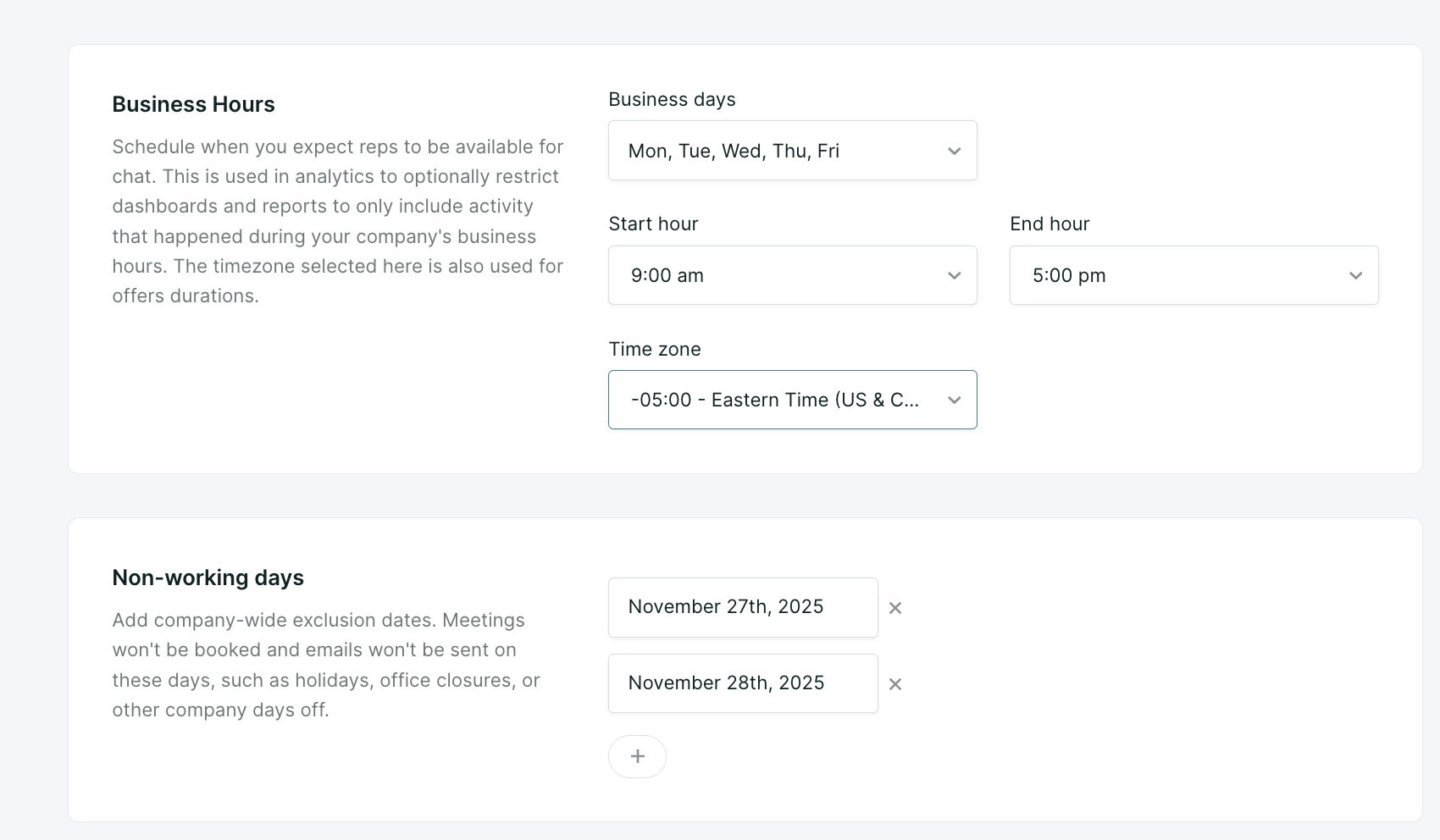 Non-working days help admins prevent scheduling conflicts on company-wide holidays or specific non-working days. By blocking these dates in advance, you ensure that no meetings are accidentally booked when your team is unavailable. This feature streamlines scheduling across your entire organization, avoiding confusion and improving the customer experience.